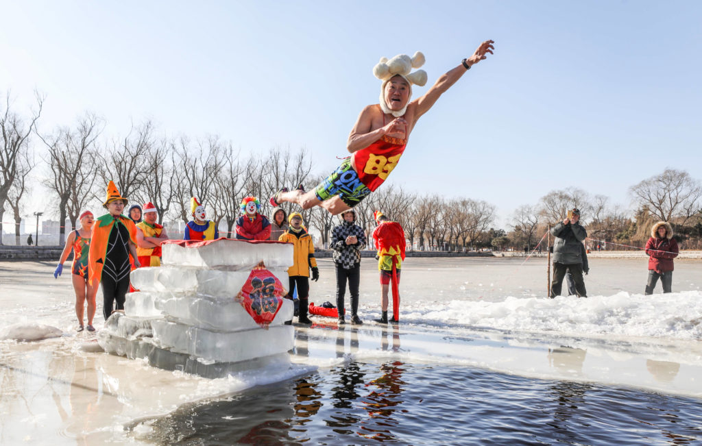 A swimming enthusiast in festive attire jumps into cold river at Beiling Park on the first day of the Lunar New Year in Shenyang, Liaoning Province of China. Photo by VCG/VCG via Getty Images