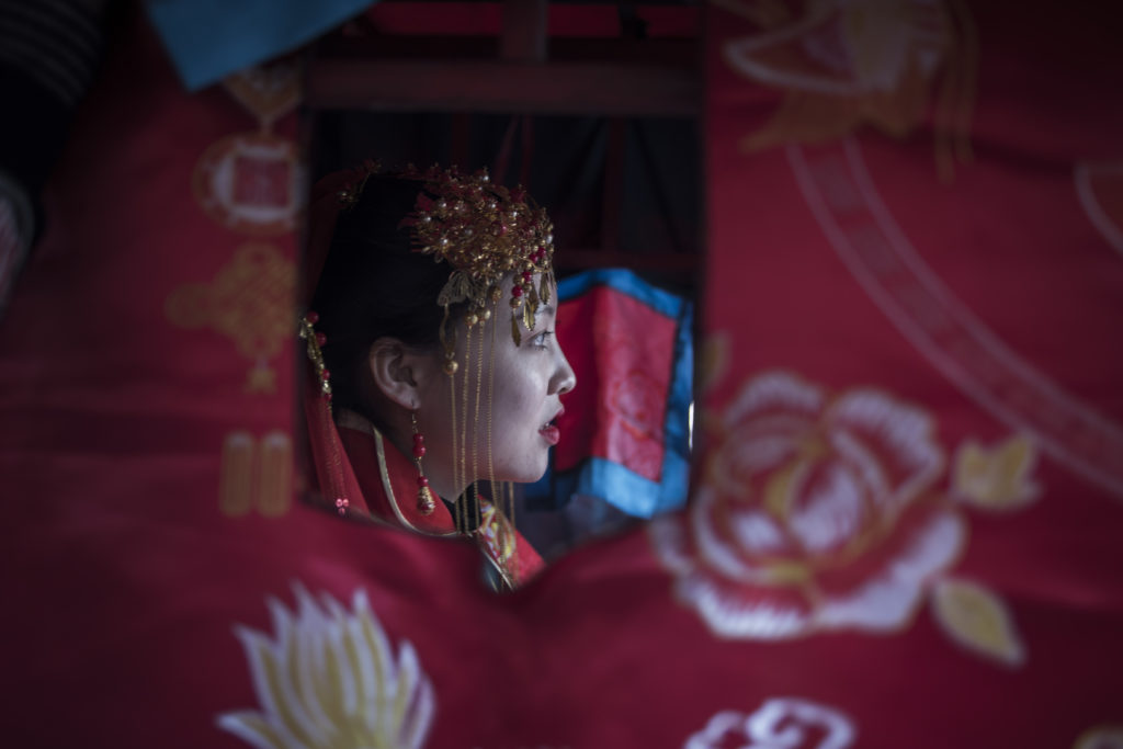 A Chinese woman dressed like a traditional bride, attends a wedding performance as part of the She Huo festival, to celebrate the Lunar New Year, marking the Year of the Dog, in Hancheng, Shaanxi province. FRED DUFOUR/AFP/Getty Images