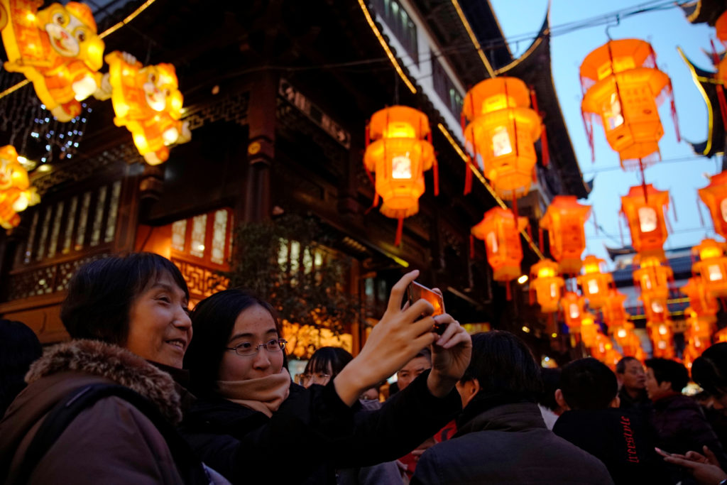 Visitors take pictures of themselves with lantern decorations for the upcoming Chinese New Year in Yu Yuan Garden in Shanghai, China. REUTERS/Aly Song