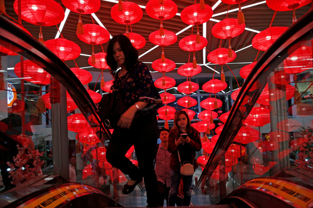 People stand on escalator decorated with lanterns for the upcoming Chinese Lunar New Year of the Dog at Ciputra shopping mall in Jakarta, Indonesia. REUTERS/Beawiharta