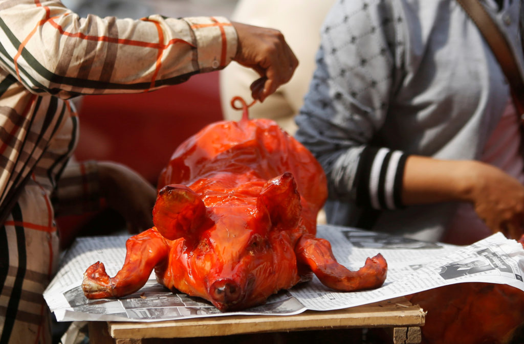 A vendor prepares a grilled pig for sale along a street during Chinese Lunar New Year, in Phnom Penh, Cambodia. REUTERS/Samrang Pring